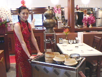 という珍しい演出が話題に。料理の提供も、点心を席までワゴンで運んでくれる上海スタイルのサー
