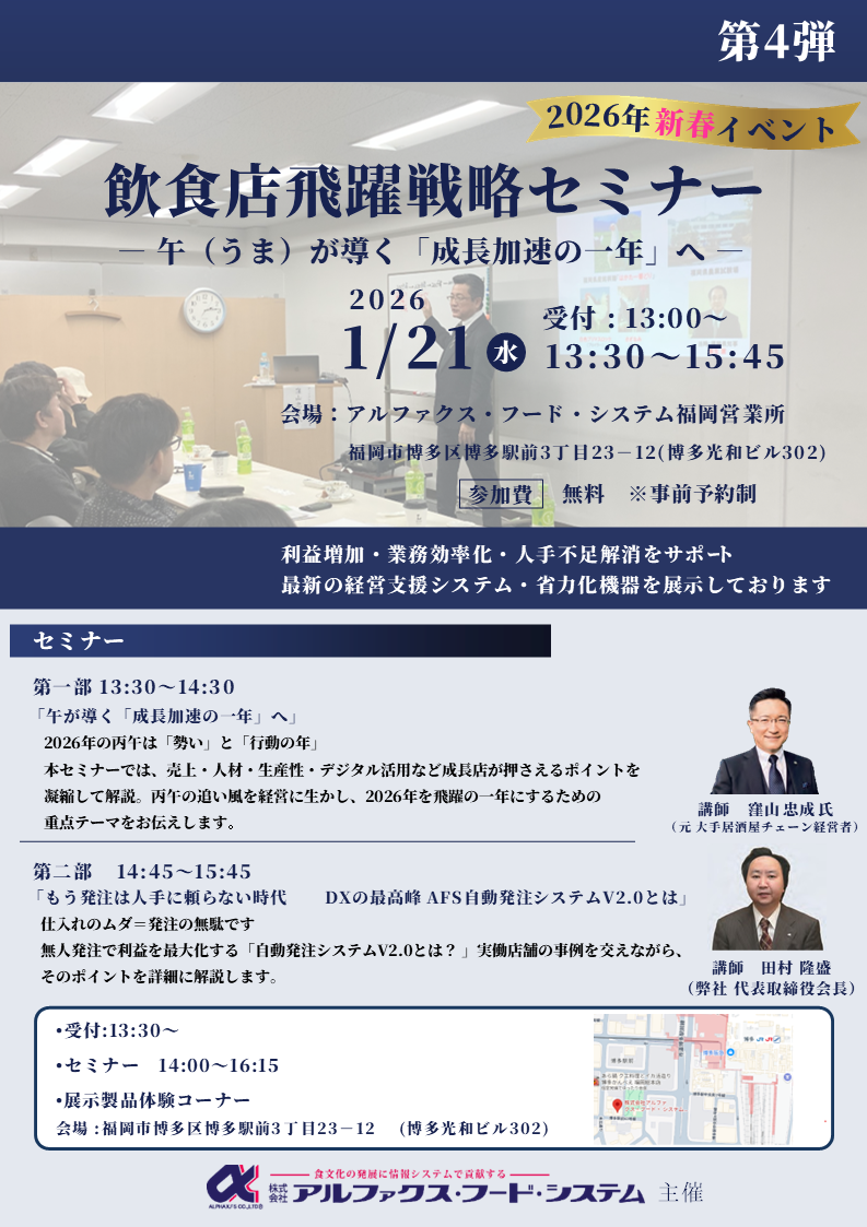 2026年1月21日に新春イベントとして「飲食飛躍戦略セミナー」を開催いたします。