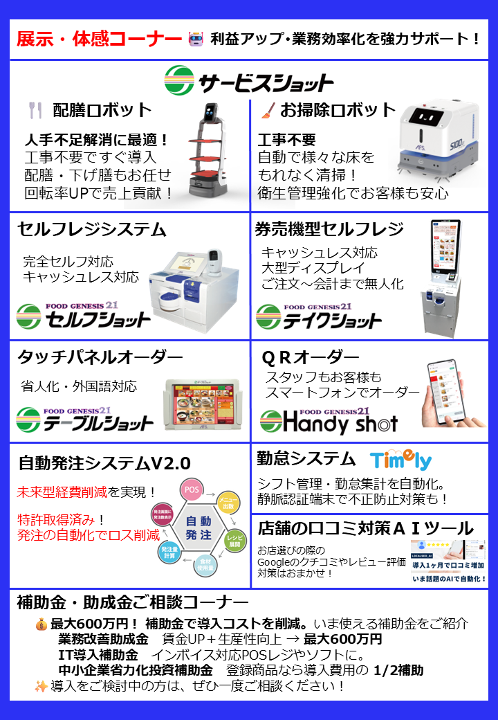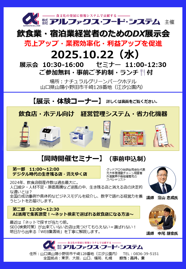 飲食業/宿泊業経営者のためのDX展示会・セミナー 大好評の福岡開催につづき山口でも開催決定!展示会+セミナー2部構成(ランチ付き)でお届けします。 お申込みは、下記お申込みフォームから受け付けております。 定員になり次第、締め切らせていただきますので早めのご応募をお待ちしております。